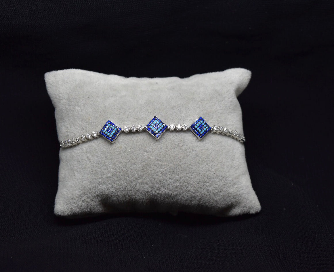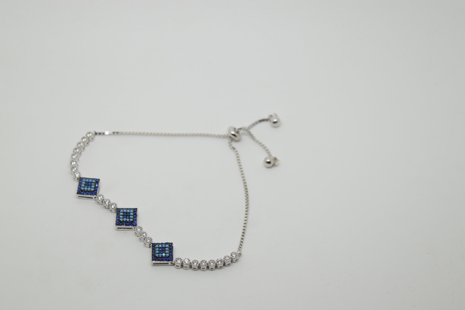 Stamped 925 Silver with Rhodium plating to prevent tarnish. Laser fitted zircon stones. Dangling end. Size adustable...