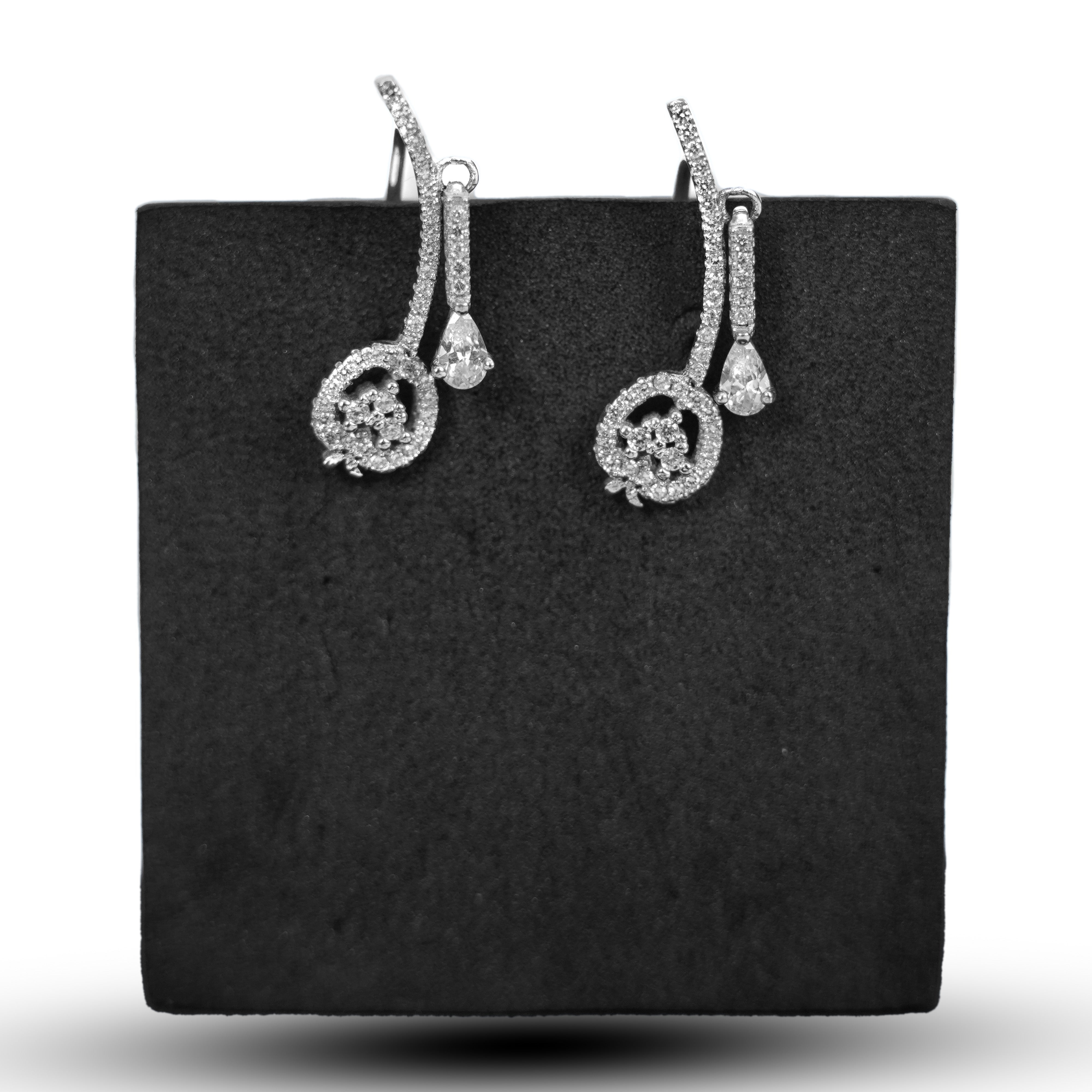 These dangles for the busy ones. Designed to be worn easily, they feature a flexible hoop to easily put on. The laser fitted zircons give these an fairytale shine.