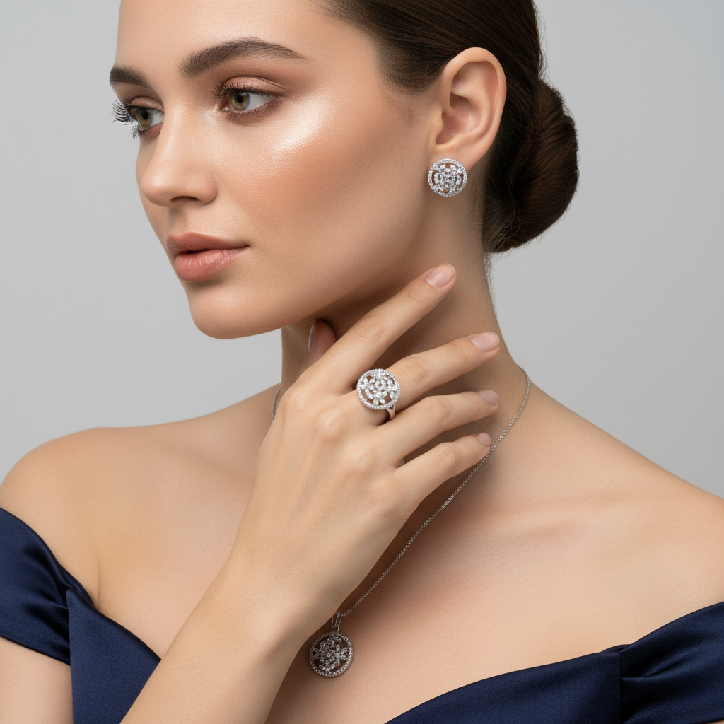Sterling 925 Silver with Zircon Stones. Includes Ring, earrings and Pendant with Chain. Ring size 6.5 US. Stamped 925. Rhodium Plated to prevent tarnish. Chain length 22”