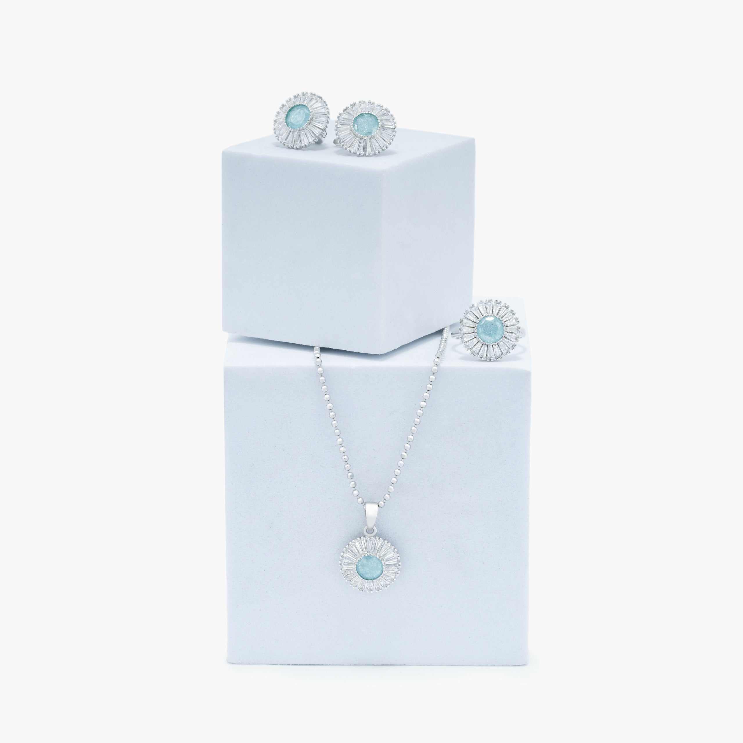 Radiant silver jewelry set featuring a sunburst design with vibrant aqua-blue center stones, encircled by shimmering white zircon accents. Includes a pendant necklace, matching stud earrings, and a statement ring—perfect for adding a fresh, luminous touch to any look.