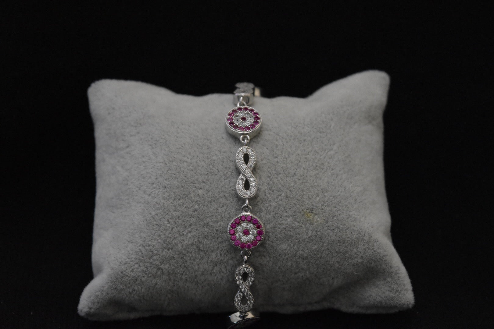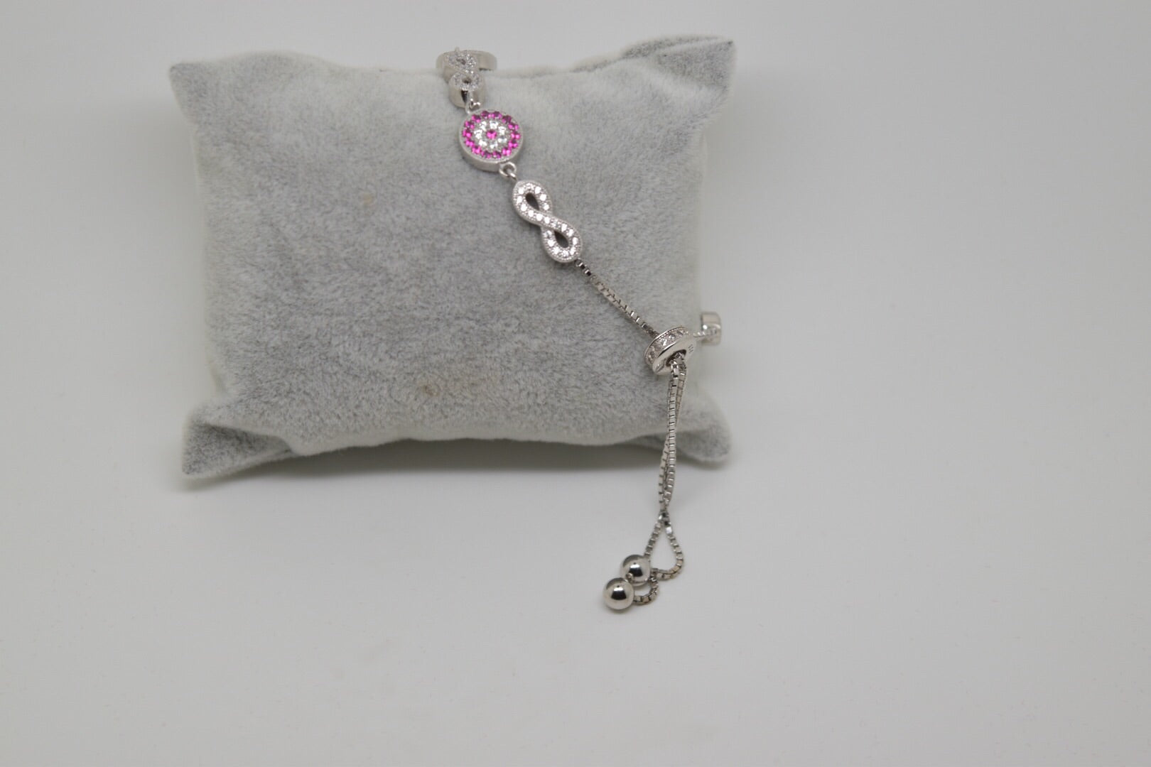 Stamped 925 Silver with Rhodium plating to prevent tarnish. Laser fitted zircon stones. Has an extension so lengths can be adjusted.