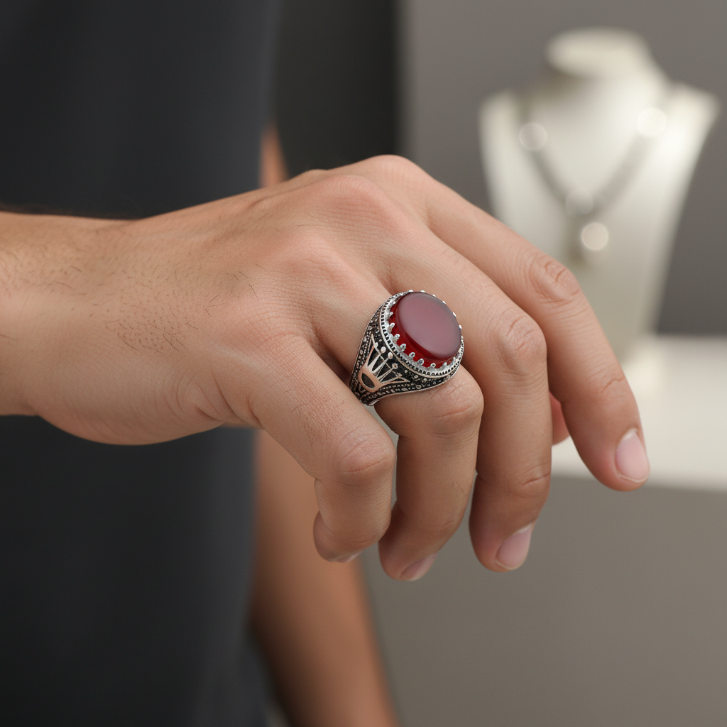 Sterling 925 Ring with Matte-Finish Maroon Zircon and Patterned Band.