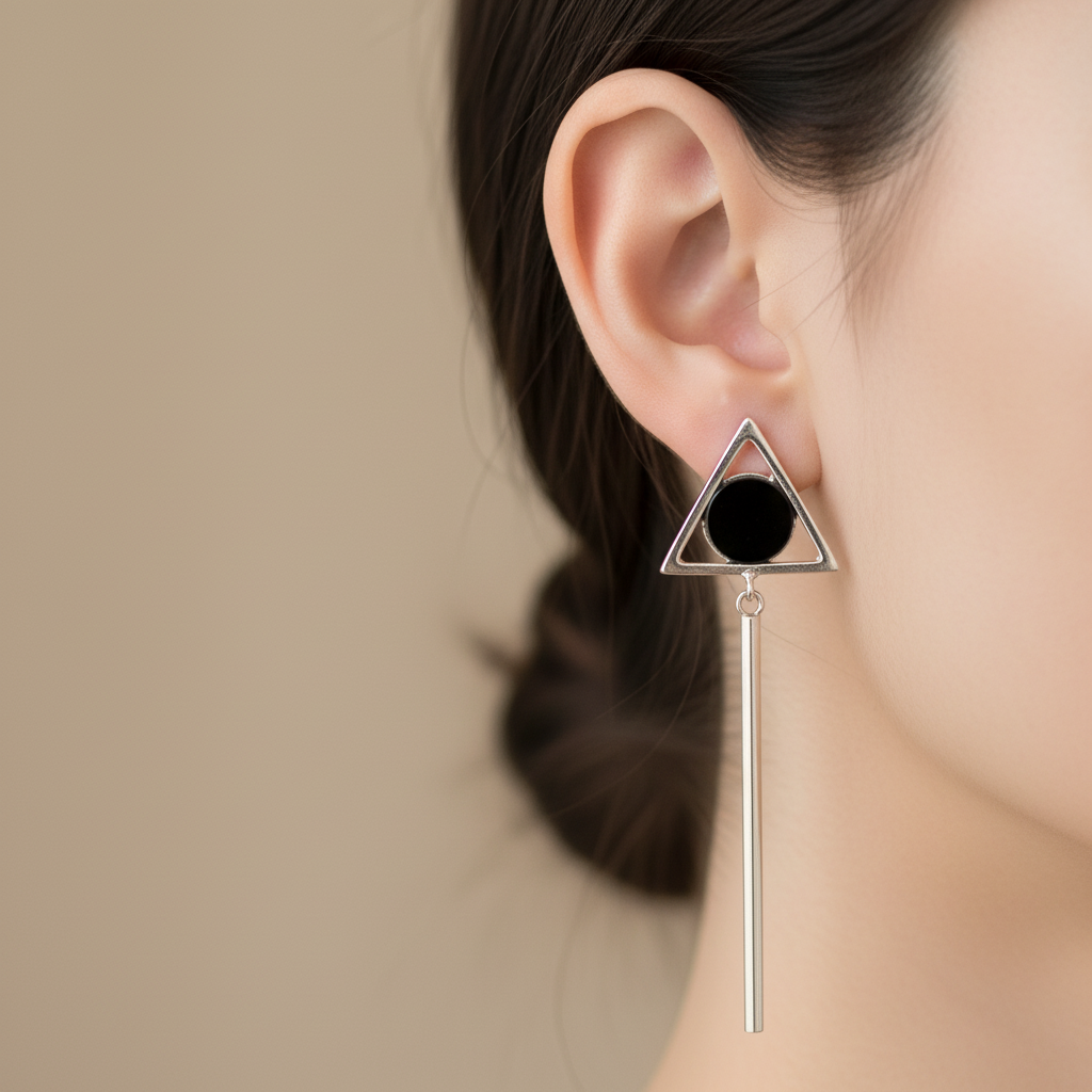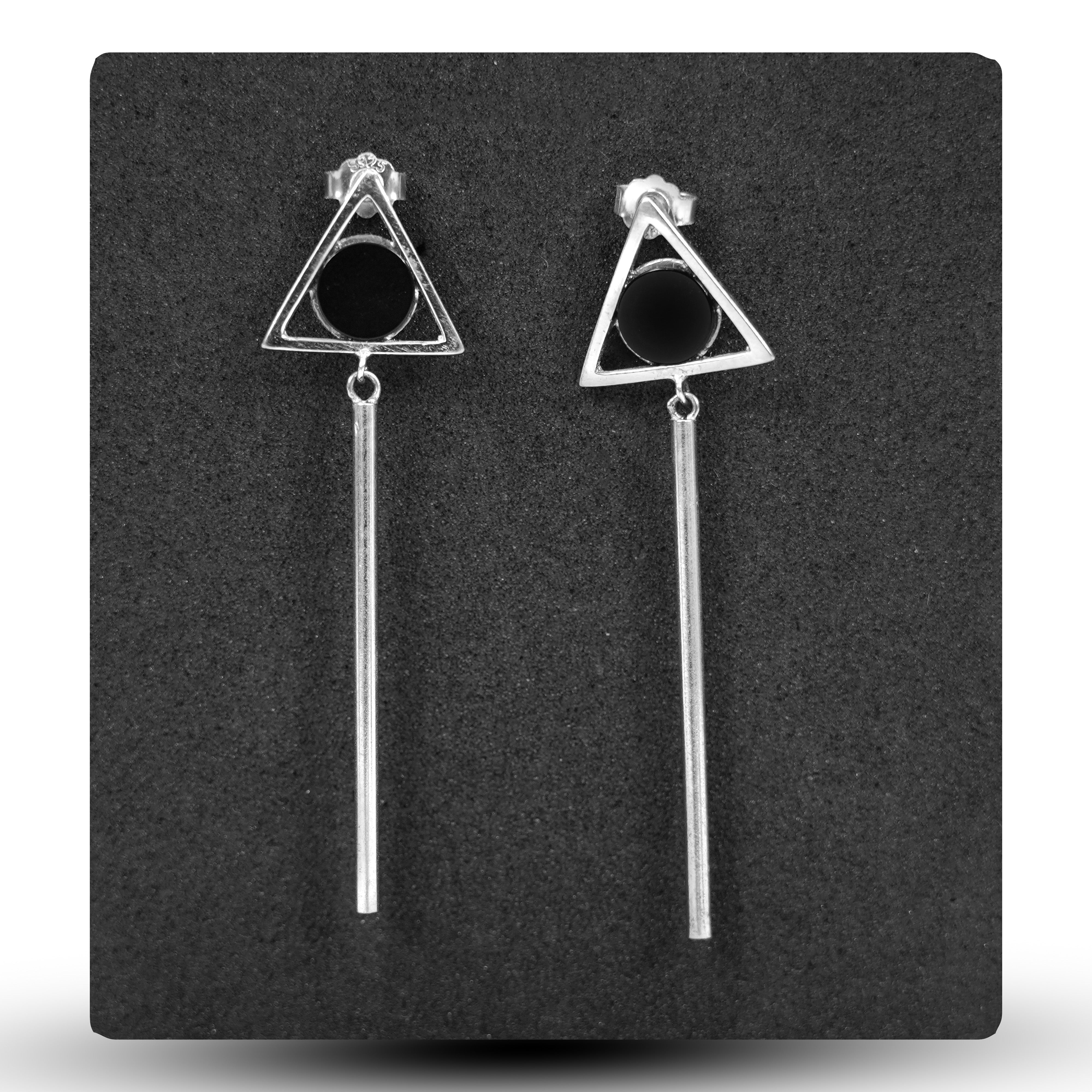 A version of our enamel series that is gorgeously designed with geometry shapes. Features a black enamel within a triangle and verticle dangle to add depth.