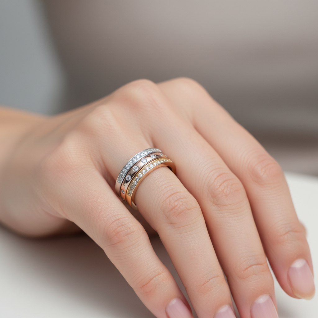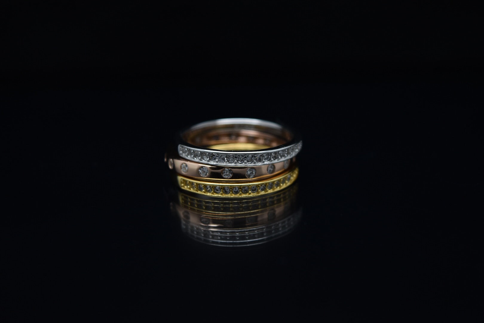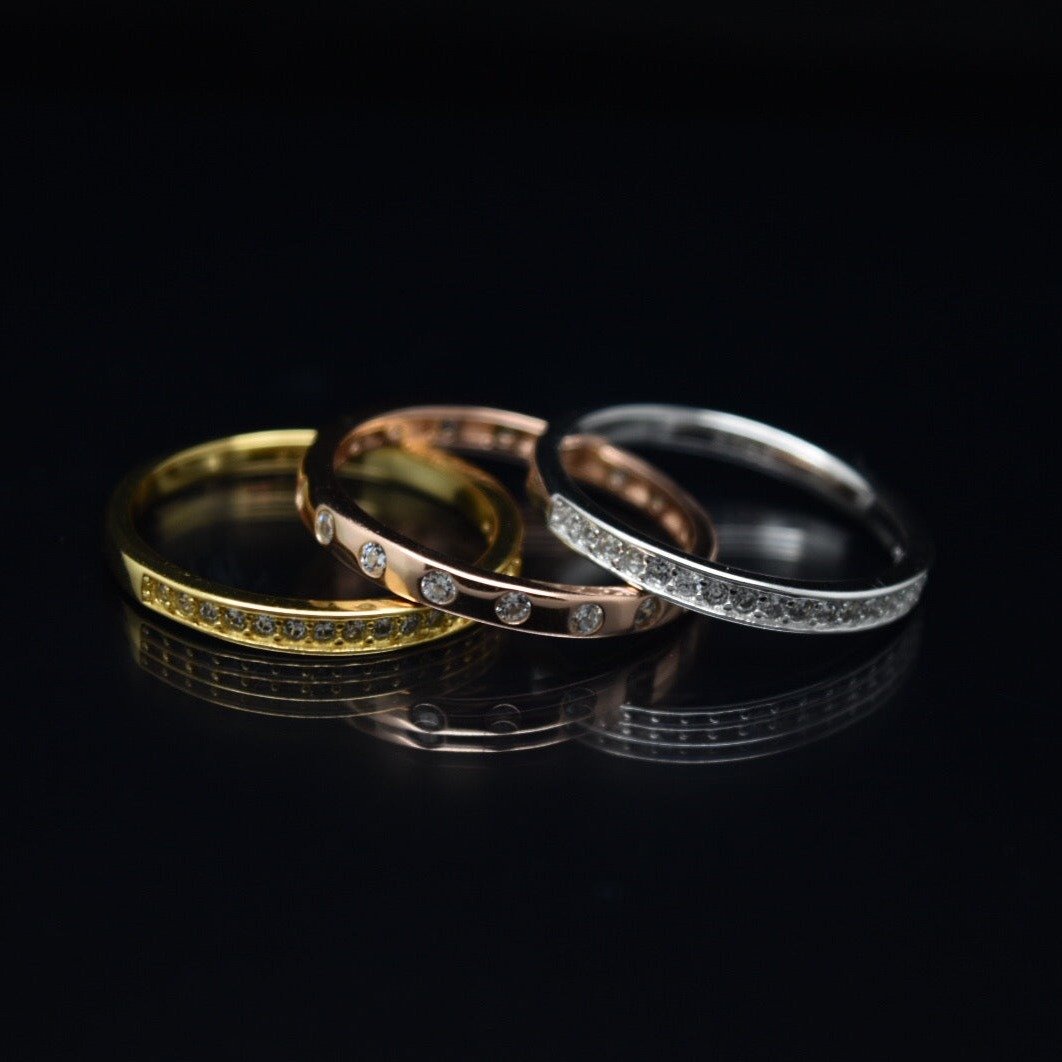 A set of 3 Rings: Gold, Rose gold and Silver. Each ring is studded with zircon HALF WAY across the band with the Rose Gold one being a little different to add personality. Made of premium quality sterling silver.